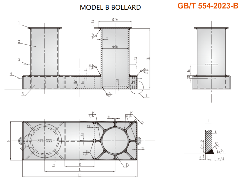 | a. The open groove deep penetration welding method is adopted to ensure sufficient welding volume and welding strength. b. SWL represents the maximum tension that the mooring rope can withstand. The safe working load in the table is derived based on the evaluation method in Appendix A and is for reference only. c. The calculated weight (gross weight is for reference only) |