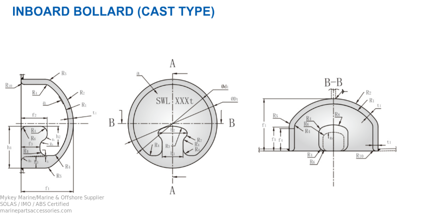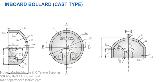 Comply with IMO MSC/Circ.1175/Rev.1 and ISO 13795 and other standards, clearly marking the safe working load (SWL), usually not less than 1.25 times the breaking strength. Differences from dock bitts - Ship bitts (Bitts): Fixed on the deck, transmitting and transferring the rope tension to the hull, being the fixed point at the ship's end. - Dock bitts (Bollard): Fixed on the shore, shared by multiple ships, being the fixed point at the dock end.